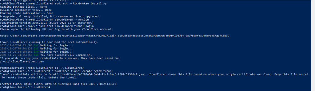 Setelah login, file kredensial akan tersimpan otomatis di: ~/.cloudflared/